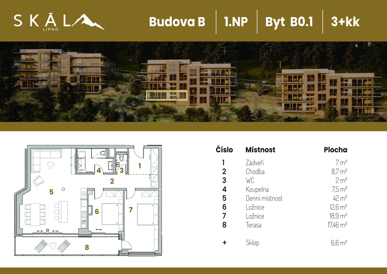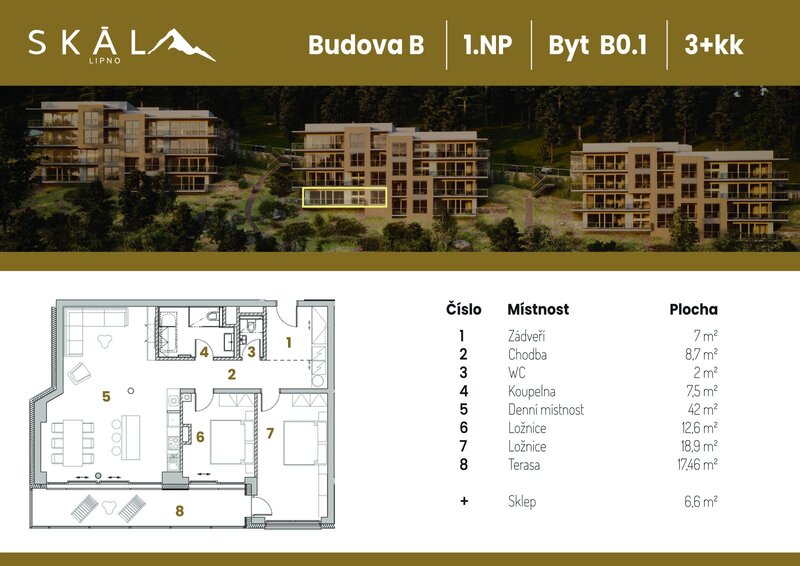 Airy, spacious and sunny apartment, which has an unobstructed generous view from every living room to the south through the existing trees to the lake with the adjacent ridge of the Sumava hills. Thanks to the slope of the terrain towards the water and the positioning of the houses on the upper edge of the slope, each apartment becomes a kind of lookout tower over the Vltava River.