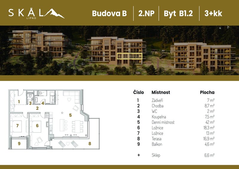 Airy, spacious and sunny apartment, which has an unobstructed generous view from every living room to the south through the existing trees to the lake with the adjacent ridge of the Sumava hills. Thanks to the slope of the terrain towards the water and the positioning of the houses on the upper edge of the slope, each apartment becomes a kind of lookout tower over the Vltava River.